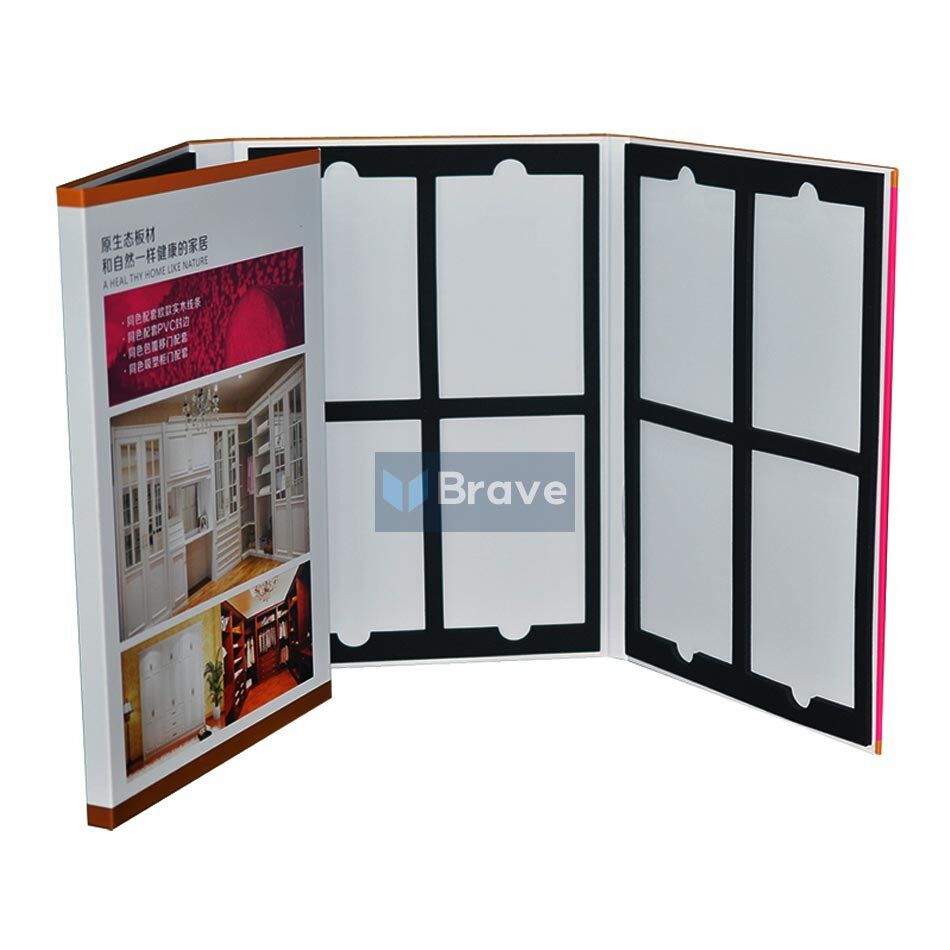 This model is 4 sample slots flooring and decking sample booklet, you can load 4PCS flooring samples each page, we can custom the sample slots size according to your needs, there is a waterproof and wearing layer finish to avoid scratching during using.